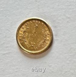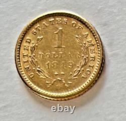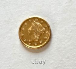 A legendary American coin, this is the first one-dollar gold coin of the USA. It dates back to the first year of production, 1849. Minted from 1849 to 1854, marking the end of production for this type 1. Rare numismatic quality for its year; EF (very fine).